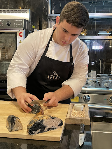 Read moreWe were staying at the Savoy Palace hotel and discovered Audax while wandering around the nearby streets. What a fantastic find! The chef/owner has a very clear and unique vision for the restaurant... to take traditional Portuguese dishes and ingredients and elevate them to appeal to more modern and refined tastes. The menu is quite small, but there is plenty to choose from. We ordered one of everything on the menu other than the 2 items that had meat and it was just enough. The portions are good for sharing and the chef recommends ordering 3-4 items per person. We had never heard of some of the ingredients, like "flying squid" and limpids. Each dish is so unique in its flavors and texture, as well as visually. We were first served a black and white bread which is made with charcoal and a small amount of sourdough, served with smoked butter and black sea salt. It was crispy on the outside and soft and chewy inside. Delicious and different. We then ordered: garlic soup with crispy bread filled with a poached egg, tuna tartar with mango and parsley, flying squid which was crispy and very tender, limpid rice served with Goliath grouper, and a pumpkin soufflé with soft local cheese and bonito flakes. For dessert we had the most amazing "apple" which was made with white chocolate and filled with white chocolate mousse and apple jam. It's hard to pick but our favorites were probably the tuna tartar, limpid rice, flying squid, and the apple dessert. The dish ware used for each item was beautiful and locally made, adding to the enjoyment. The dining room is modern and elegant with gold chandeliers and comfortable seating. Every single person working there was top notch at their job and made us feel welcome. The chef explained each dish and how he was inspired to create it based on its historical roots. Dining at Audax is more than just having dinner, it's a complete experience. I would say that it rivals some Michelin Star restaurants in its quality, uniqueness and flavors but at a fraction of the price. I highly recommend Audax! TIP: Sit at the chef's counter if you have the chance and watch the food...