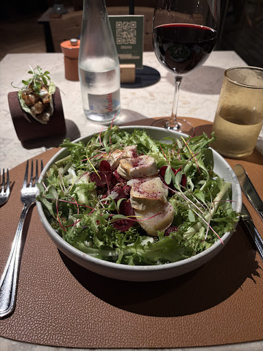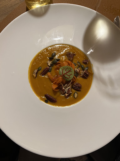 The food was forgettable as a veggie. One soup option, three uninspired salads, and a main course that was literally half a gem lettuce with a drizzle of gorgonzola (a side salad at best) —for 15 euros. My starter salad was actually larger than the main. Everything else leaned heavily on over-complicated presentation rather than actual flavor. It’s not the price or the plating that’s frustrating—it’s the clear sense that they know they can get away with it.
