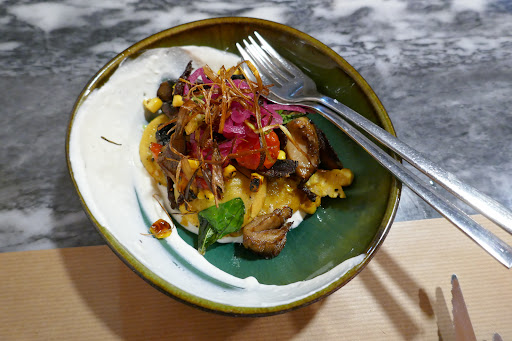 We ordered one plate to share, and an entree for my husband and I had another starter as my meal. We also shared a dessert--I felt like I had no room, but then some was found! Everything was delicious and beautifully presented. Best was the duck, then the ravioli, then tempura (which was great, but a tad under salted and I wish there was more aioli). We had the honey cake for dessert, which was a big quenelle of cream with honey cake folded in, drizzled with honey and what I think was pulverized dried orange peel. Really tasty!!