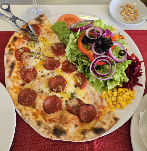 Was expecting better considering the reviews. Went for lunch . Had the mushroom appetizer. They were very fresh and very tasty. Had the ½ pizza and ½ salad. The salad like all salads in Madeira was very good. Very fresh ingredients. You make your own dressing with olive oil and vinegar. Can't go wrong. The pizza though was not great . IMO. To make a great pizza , you need good dough. This was not . Very dense. Not enough air. Theirs a couple of very good pizza places a block away. If your specifically looking for pizza , go to those places. Maybe the pasta is good here , but we didn't try it. House wine was good , but for €16 you can do better. The other pizza place has a bottle of house wine for €12 , and it was also good. They have a decent size patio which is great when the...