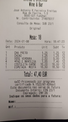 Read moreGreat food at this lovely little restaurant. Whenever we're in Funchal, we love to have an evening meal here. The food is great and the atmosphere is good. The staff are very attentive. I had the meat skewer this time and my wife the lamb chops. Both were delicious. Be aware that you only get one side included with meal. If you want potatoes and vegetables , that's an extra cost. My only negative, which is why I give it four stars out of five is the price of the bread and butter. It's quoted as €1.85 per portion, however it is €1.85 per half slice. €7.40 for four half slices of bread and two butters is ridiculous. We will return but will remember not to have the...