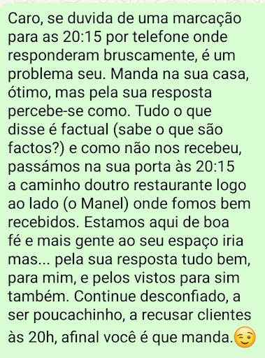 Read moreInfelizmente nao posso classificar a comida nem o ambiente porque nao me foi permitido, a má classificação é simplesmente pela má formação de carácter e o "estar a borrifar" dos funcionarios, deste cafe/restaurante que ate pode ser bom... Cheguei a este estabelecimento perto das 21h, a casa estava vazia e os 2 funcionarios a conversa sentados numa mesa, logicamente vi que nao iria jantar ali mas mesmo assim perguntei se serviam jantares, foi-me dito que não em modo de despachar o cliente, ok ate ai percebo , possivelmente estavam perto da hora de sair, no entanto quando perguntei se sabiam de algum sitio na zona onde poderia jantar foi-me dito " ah nao nao sei de nada nao ha nada" de uma forma muito arrogante, qual é o meu espanto que ando uns 30 metros a pe ou nem tanto e esta um restaurante onde fui muitissimo bem servido " O Manel". Esta falta de caracter ou nem sei o que lhe chame foi pessima... de lamentar haver pessoas assim