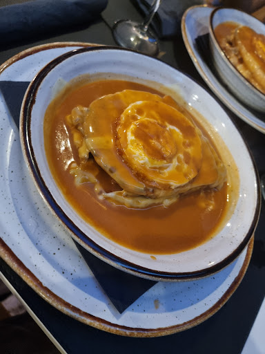 Nao resisti e fui conhecer a francesinha um espaço bonito pacato com pouco movimento e um preço bomba vamos encher este espaço paguei 10 euros por francesinha mais cafe e 2,50 pelas batatas fritas o molho tradicional cremoso e picante fiquei bastante surpreendido bife tenro pao torrado no ponto e sem ser aquele pao gigante que embola na boca a unica coisa que alerto e que colocam bacon na francesinha mas como n sou eskesito gostei bastante ja paguei mais e comi pior e aqui na minha zona de RIO TINTO, a sangria de maracuja mt boa e tinha a cerveja que mais gosto a...