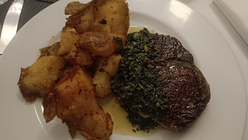 Hotel muy tranquilo donde hicimos cena un menú de 30€ sin bebida que costaba de una crema de zanahoria de primero sin opción de escoger nada más y dos carnes y dos pescados de segundo.Elegimos una carne Angus buenísima y un lomo de bacalao un poco seco pero muy gustoso.guarniciones muy buenas. El servicio excelente