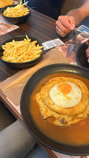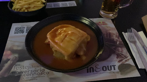 I have been eating at In & Out Bistrot Club last evening. This is a mix of a disco club, a bar, and a restaurant. They have TV screens for those passionate about soccer. You can either seat at the bar or at a side table. The bar is furnished with several local and international liqueurs. They have an extended choice of different drinks: from draft beer, to cocktails. I have been there for dinner in a cold day. I asked for a warm soup of the day, but unfortunately it was not served that evening. Than I opted for a francesine. It is a typical dish from Porto. My very first time and I loved it. A rich taste, due to beef and sausages covered with bread and warm melted cheese, and with a delicious souce. Mine had an egg on top (Pita Francesinha). While waiting for my dish I ordered a large draft blond beer. Very good and fresh (just €3). And to finish I had a delightful dessert: the petit gateau with vanilla ice cream and caramel as a topping. I enjoyed the service. All the waitresses and waiters were very kind and smiley, and they all spoke English, or I would have had a tough moment to order my food. I definitely enjoyed this place. I will come back in the next days, while staying in at Guarda. I suggest you all to come and eat or just drink something here. You...