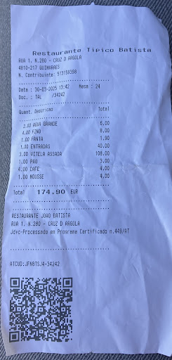 Read morePris la spécialité (balcalhau), grand plat pour deux. Délicieux ! Servis à 23 h malgré une fermeture annoncée à 22 h 30. Très grand bonheur de ne pas entendre un seul touriste et de parler avec le patron fondateur qui vous montre les photos de politiques de premier plan venus manger chez lui et leurs écrits dans le livre d'or. Faïences et objets en bois un peu partout au mur et au plafond. Ambiance chaleureuse et typique. 43 € pour deux avec entrées, balcalhaus, bouteille de vin de la casa, cafés et glace. Excellent rapport...