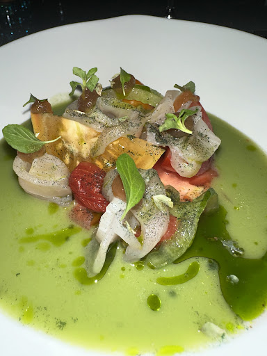 The meal began with a prawn brioche that was nothing short of perfection - not only delicious but also visually stunning. Next was a very refreshing cured yellowtail with green gazpacho - each bite was a symphony of flavors and textures. The artichoke, mint, lemon and sunflower seeds dish, presented in three different ways—purée, chips, and a delicate slice—was a true work of art, showcasing the chef’s creativity and skill.
