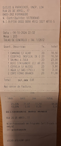 We visited Novo Mundo in Ferragudo based on positive reviews on Tripadvisor. As starters, we ordered 1x baked mussels (EUR 11.00) and 1x Cocktail Tropical (EUR 16.50 shrimp cocktail). The mussels were not available according to the lady serving us (Fiona on her shirt, the owner?) but she recommended the prawns (EUR 18.50). The tenderloin was also not available, so I chose the Beef Stroganoff (EUR 22.00) and the grilled salmon (EUR 23.00) as alternatives. All in all, not an easy start. About the starters: Cocktail Tropical turned out to be half a pineapple shell filled with pieces of shrimp, drenched in dressing, making it taste like mayonnaise. What a disappointment, and that for EUR 18.50. A better name would be Cocktail Fiasco. The prawns, on the other hand, were well-grilled and delicious. About the main courses: The salmon was well-grilled but served unimaginatively as a salmon fillet in a soup bowl; floating on yellow sauce, topped with a slice of orange, a small tomato, and a leaf of thyme. The Beef Stroganoff was served in a soup bowl with some fries and rice. The meat was not tender and contained sinews. The rice had a chlorine aftertaste and was simply inedible (washed in local tap water??). Given this experience, we did not want any dessert and asked for the bill. It amounted to EUR 142.80. Checking revealed that a Chateaubriand of EUR 45.00 had been added. With some laughter and “sorry guys” from Fiona, a corrected bill of EUR 97.80 was finally presented. Prices at Novo Mundo are over the top, and the food served here is not worth half of it. About the service: No smile at all. When clearing the table, no question about whether the food was to our liking. Conclusion: The prices at Novo Mundo are scandalously high for what you get. You feel like a ripped-off tourist here, knowing that next time you should avoid this restaurant. A disappointment and not...
