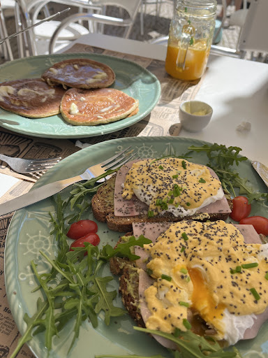 The eggs Benedict with ham were excellent. It included avocado, which made it even more delicious! The pancakes were yummy, although they don’t have maple syrup, but they do have powdered sugar, honey, or Agave syrup. The orange juice is fresh, and the cappuccino was very good.