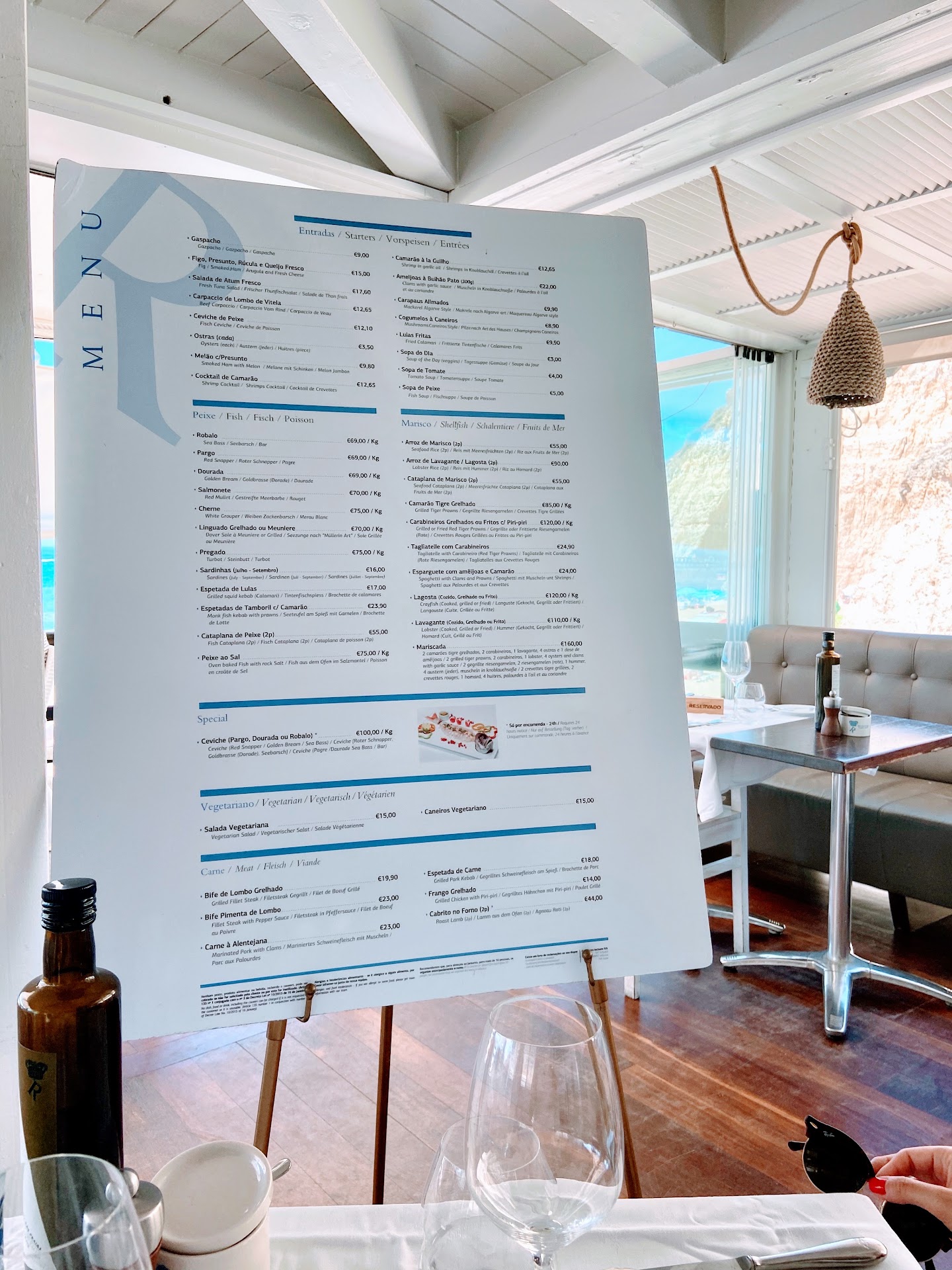 Read moreWe would love to give this restaurant 5 stars. When we sat down the very friendly staff put on our table Couvert (small bowls of olives, carrots, beet cream cheese) and bread in a bag and Queijo Curado (a small round of cheese) and said this is for us to start (seems totally complimentary) and do we want still or sparkling water which he also had in his hand (but didn’t mention that we could choose a small bottle. The large bottle is a lot of water for 2 people! ). Everything seemed so fine and we were happy. The food was delicious!-mushroom risotto for a vegetarian is as good as it gets. My husband ordered the steak and the waiter suggested medium-it came well done. He said it was fine with the pepper sauce on it. The waiter was interactive and friendly. The view and ambiance were top notch. But…when we got our bill they had charged us 6,40 for the Couvert and 3,80 for the Queijo and 4 euro for the large water. This isn’t something we ordered, they gave it to us! And then we’re charged for it?! On top of that, when we paid and they brought us our change, they shorted us a euro. All in all, we paid about 13 euro more than we should have been charged or that we expected. It is an expensive restaurant and we expected that being on the beach and all but we didn’t expect it to get charged for things we didn’t order. We felt it was quite deceptive. We had to go away with such mixed feelings. Great food, great staff, great ambiance. But they are not being honest...