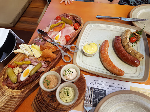 To the owners: Overall the experience in the restaurant was good. At the butcher shop not so much, first time ever in Portugal that I've been made to feel bad for exercising my right to the priority law in Portugal. For those who are unaware, it's the law in Portugal that people with children (especially babies), disabilities, elderly and now health care workers are by law to be served first at any establishment that provides service, regardless of the line up and time people have been waiting in line for their turn. This was the case that happened to us at the butcher shop, we arrived and and older German lady was waiting to be attended at the butcher shop. She assumed we were trying to skip the line (in this case only herself waiting) and proceeded to yell at us in German clearly indicating for us to get behind her which we obliged. I clearly positioned my 7 month old baby visible to the attendant in the shop in hopes she would recognize her obligation. She did not and when was free proceeded to attend the German client. I immediately intervened and enquired if they complied with the priority law in Portugal to which she irritably replied the law is to be complied with all over Portugal. As the German lady now accompanied by her husband was yelling at me to get out I asked the attendant to explain the law to her customer. She did and that ended with the German lady throwing a hissy fit, storming out and as later I discovered said she would never return. I proceeded to do my shopping after having to break the very cold ice now that had formed and was very palpable between myself and the attendant now. She seemed to have warmed up after seeing that I was actually there spending euros and not just window shopping. At the end when paying I apologized to her for any confusion that my family might have caused with the misunderstanding with the previous customer to which she replied, "ya well, they were our long time customer but we probably lost them for good now because of it". Completely unnecessary comment and attitude! In terms of the restaurant, amazing! Staff were excellent, food was delicious and not overpriced and atmosphere was friendly and accommodating. Our baby was a bit of a show with all the wait staff and customers alike, complete opposite experience from the butcher shop! Highly recommend the restaurant. We had the charcuterie board (excellent combinations and presentation), trio of sausages accompanied by bread and mustard (also delicious) and all of it washed down with a bottle of Soalheiro, a delicious vinho verde from Monção that was perfectly chilled. All in all a great food experience but more to be desired on the commercial side hence...