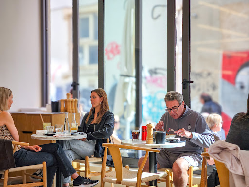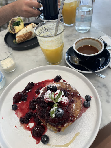 Modern and popular brunch spot with very filling pancakes.