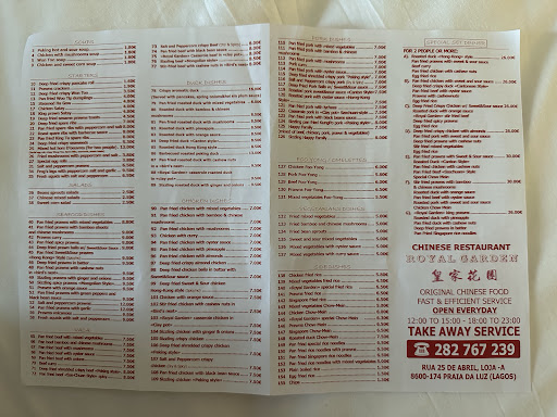 Royal Garden Review: We came here on our second night ever in Portugal and it was very busy. Once we were seated it took along time for someone to come over and ask for drinks order / food (approx: 20mins). Then once we placed our order it took another 40 mins to arrive. When it did arrive a mistake with the order was.mafe and the wrong time was made (prawn balls instead of chow mein) this then resulted in a later issue of my wife not being able to eat her.main dishes together and we were charged for it and then had to do the whole contend the receipt to get the correct fee.