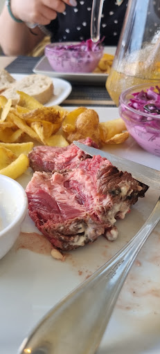 Overall opinion first - not really worth the money. Now for details. I got a glass of red wine for my steak dinner and it was way too warm, now don’t tell me “room temperature”, red wine should not be this warm, especially in a place “specializing” in meats. I got the 300 gram ribeye, grilled MR. The steak came out and I could tell right away, from decades of dealing with meat professionally, that it was under the promised weight. The menu claims that they only use salt to preserve the meat flavor, but I guess the kitchen lost their salt dish today because the steak was 100% unseasoned whatsoever. The coleslaw was red cabbage in mayo water with raisins that were sitting in it for so long that they had become grapes again, this too didn’t have a grain of salt in it. The crispy potatoes would have been nice, if they had some salt on them, which in line with the rest of the food was completely devoid of any salt. Now back to the steak again - I had asked for MR, but half the steak was overcooked to a MW and tasted as if someone had set it on fire. Not a pleasant grilled flavor, but rather of burned fat and yuck. The menu also claimed that the meat was matured and I can guarantee, from having dry aged many cuts over the years, that it was not (aged meat has a different aroma, flavor and texture, all of which were not evident here). I got the garlic butter as a sauce (for an extra €2), but instead of garlic flavor, it tasted of tons of old dry rosemary (and there is literally a plant of fresh rosemary sitting outside the restaurant). After cutting into the meat, the server came and asked if it was cooked perfectly. I said “no”, and she smiled and walked away. Another server came over to clear my plate at the end and asked me if it was good, again I said “no” and she took my plate and walked away. I was on a tight schedule and hungry and just didn’t have it in me today to complain and waste time. 1 out of 1 would...