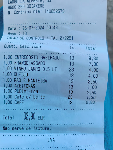 Oh dear. Disaster. One prato do dia but it is not inclusive like most places. Incredibly slow service. Shockingly bad bife a portuguese (very salty, also sweet, swimming in fat, meat like leather, complete with bits of bone and grissle :-( ...), over priced dourada (hardly any fish, over cooked) Won't be going back - it was lunch time on a Friday - food should not have taken nearly an hour to deliver and it really was the worst bife we've ever had, and, we've tried a...