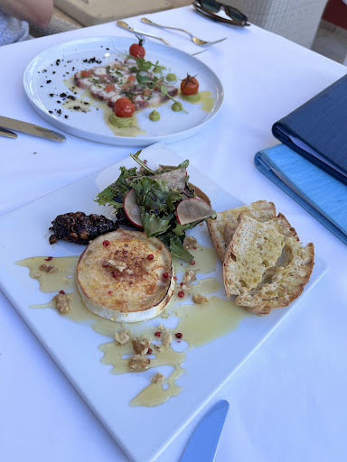 We sat on the covered patio, which featured lovely white and neutral-toned decor that created a relaxed, elegant vibe — though it was a touch warm on the day we visited. The ambiance was elevated even more by a fantastic live musician playing upbeat, yacht-style background music that added a cool, coastal energy without being intrusive.