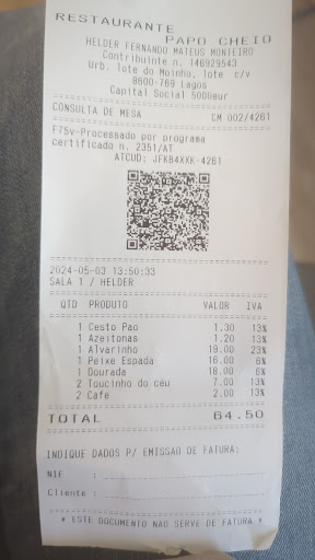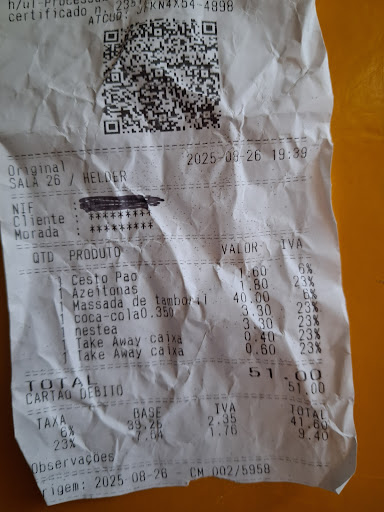 Para finalizar, paguei e o total foi 51 € (ver nota) , o que incluiu 40 da massada e 3,30 de cada refrigerante num total de dois, além de azeitonas e pão, e duas embalagens para levar o que sobrou.
