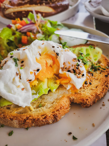 In fairness, the egg came out steaming so it had just been made. The pretzel was warm as well. That was nice. And we probably wouldn't have had as big an issue with the wait had it not been for the quality of the food and portion size. For avocado and toast, you get 1 egg. And the egg was overcooked, and the yolk broken. (See photo.) There was no flavour at all. It was just sliced (browned/bruised) avocado and a single overcooked egg on buttered toast. Not even any salt or pepper. (The sesame seeds and herbs look pleasant, but they added no flavour. Portuguese fresh herbs are not very potent.)