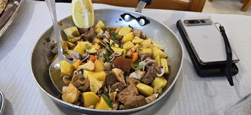 Read moreA very local experience plus one of the best meals I've had in Portugal! I came here at 6pm to reserve a table for later the same evening and apparently the restaurant was fully booked until 9pm! It didn't look much but it was a sign of good food. Me and my boyfriend ordered grilled squid and a swordfish. Both were delicious! My boyfriend is not a seafood lover but he said that the grilled swordfish was the tastiest fish he's ever had! The food is served with potatoes and vegetables. We also ordered a jar of green wine which resembled cava and prosecco but better! The prices of the main dishes were very affordable (10-13€ per portion), however, we were charged 4.20€ for the bread, olives butter, and cheese, while we only ate the olives and bread. The menu specified the prices of these sides separately and we thought we'd be charged for only those that we'd eat. Unfortunately we were charged for all of them and that's why this review is getting 4 instead of 5 stars. I'd recommend asking in advance about the couverts or just skip the olives&bread and order an actual side that you would...