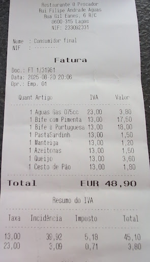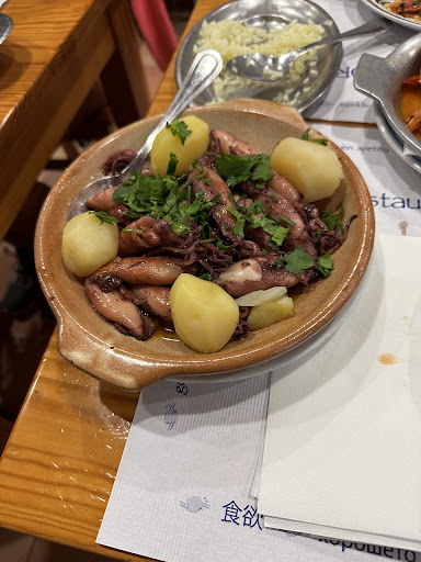 Fine, we ordered our meals: starter – mussels, mains – sardines and steak Portuguese style. The mussels were old, one even had an insect inside, and they tasted absolutely awful. We called the waiter, showed him, and got new mussels, which this time were fresh! Why not like that from the start, dear owner? The sardines—how can you go wrong with sardines, right? Well, they were drenched in oil and garlic, the side dish (boiled potatoes) also drowned in oil with an extra portion of garlic on top. The steak “Portuguese style” was a joke—not a funny one. It was swimming in butter, oil, and fat, and the single strip of bacon on top is supposed to make it Portuguese? Ridiculous. The side dish, fried potato slices, were bone dry. We ordered rice as an extra side—it was soaked in oil as well! Oh, and the waiting time for the food was absolutely terrible. We sat down at 6:30 pm, and two hours later, after we finally ate, we paid right away! After just one hour, my wife and I already had stomach problems.