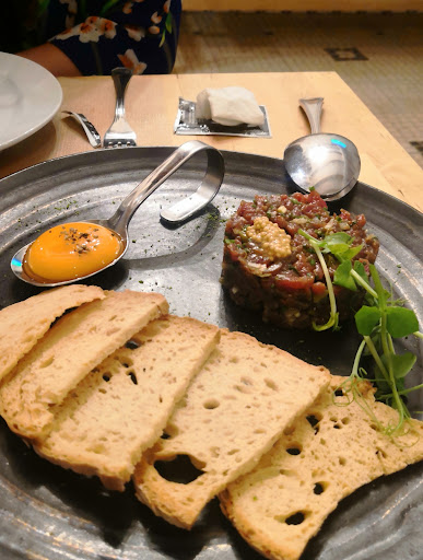 Food was superb. Starting with, snack food: bread and the house selection: doritos-like crunchy bread and warm bread bun. The mixed cheese with cured meat and the mayo were very good to keep us entertained while waiting. Crispy squid, ibérico pork loin strips and chicken wings. The squid was very good, texture and the dipping sauce was great. The pork loin was tender and fresh, with herbs, white wine, lemon and apple sauce, to keep it fresh and light on your palate. The wings were very flavourful, a bit on the dry side (maybe) but very nice taste, can't really fault them. After that we had the mackerel and steak tartar, both finger-licking good!!! The mackerel melts in your mouth, accompanied by slow fried onion and peppers in white wine and lemon sauce. The waiter mixed the steak tartar with the egg yolk and mustard in front of us. Everyone was very, very, very nice. They all spoke English. In fact, one of them speaks English, Spanish and Portuguese. The other one speaks English, German (he spoke to the table next to us) and Portuguese, obviously. At the end of the meal the Chef came to see us, and he spoke Spanish, Portuguese and greeted us in English too. Totally recommend this place!! See you tomorrow!