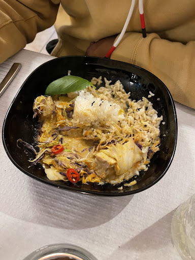 I ordered chicken rendang. I mean... there was chicken in it, but I don't know what definition of rendang they're going by. Mine was a bowl of grey slop. Totally unappetizing to look at. It tasted fine, but not like rendang at all. Just some basic European-style "curry". It had none of the spices I'm familiar with in rendang from Malay or Indonesian restaurants. Also, it was absolutely swimming in sauce. Like a soup. In retrospect, it was honestly far closer to a bad Thai green or massaman curry. I suspect perhaps that is what I got. I can't think of any other explanation for how you can screw up rendang so that it is completely unrecognizable. I also am convinced they have no idea what nasi lemak rice is. They served me some bland white rice with a bit of toasted coconut on top. At the very least, it should have pandan, coconut, sambal, egg and anchovies.