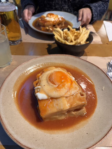 We had really good francesinhas here, and service was very friendly. They had a lot of options, from meat ones (sausage and chorizo) and vegetarian ones. We ordered a meat one and a vegetarian one, both were extremely delicious. The vegetarian one had mushrooms, eggs, cheese, and had tomato sauce. You can also order a completely vegan one if you’d like, and they even offer extra sauce for your meal partway through! (We thought this was extra nice). They have other starters/appetizers and dessert as well. The area itself is cute and has a decent amount of tables, but make reservations if it’s a big group as they only had one “big” table. The lemonade is yum, but be aware it’s very tart. The beer was also good and they fill the beer up in a really cool way-it’s magnetized on the bottom. Overall, we enjoyed our experience here and...