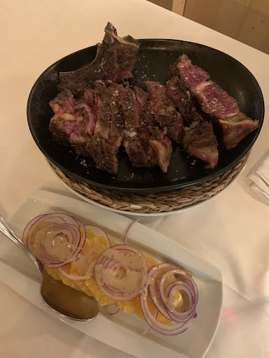 We went there during the, for dinner, without a previous reservations. There were a few tables empty. We did not have to wait and were promptly seated. The staff was kind and able to recommend some dishes. There are a few special dishes recommended by the chef. We ordered bread and “morcela”. The morcela was amazing- crispy on the outside and served with jam (i think?) which contrasted beautifully . We went all in and ordered chuleton (only available for 2). It is expensive but quite well worth it- medium/rare and really soft meat. It comes with a side dish of orange, which I enjoyed. We also ordered a side dish of French fries with truffle and cheese- the fries were good but it did not have that much cheese and lacked the truffle flavor. To drink we ordered 2 glasses of Italian wine (4-5 euros each). The place is really nice and chic. It has mainly meat based dishes. It also offers a huge wine selection, available to buy separately to take home. Overall we enjoyed our meal but it is quite expensive. What we were disappointed with was the fact that it took a long time for the starters to come, and around an hour for...
