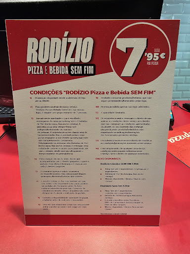 Almoçamos hoje o Rodízio. A pizza é realmente de muita qualidade. Gostei muito da massa. O que me parece um tanto estranho é o formato do rodízio que é cheio de exigências (conforme fotos). Nesta loja tem disponibilidade de duas opções de rodízio: 7,95€ pode escolher apenas 2 sabores. E outra opção de 9,95€ que pode escolher até 5 sabores. É obrigatório que a primeira pizza seja tamanho king size e a atendente não autorizou escolhermos mais do que 2 sabores nesta pizza gigante. Só é permitido pedir outra pizza após consumir 100% da primeira...