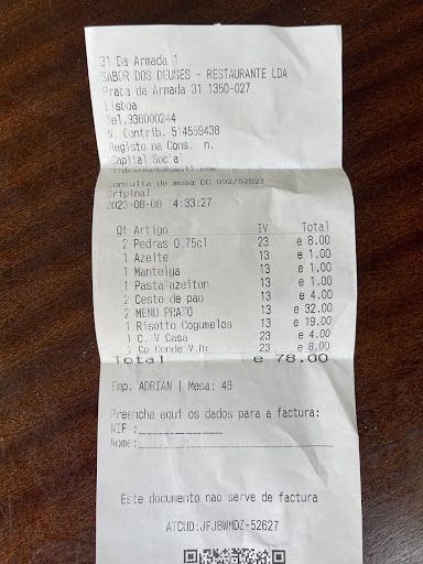 This kind of behavior raises serious concerns about the restaurant’s transparency and honesty. Not just because of the initial error, but also the attempt to manipulate the bill and charge for items that were never served. The overall impression is that Restaurant 31 da Armada is more interested in inflating its customers’ bills than providing a quality dining experience.