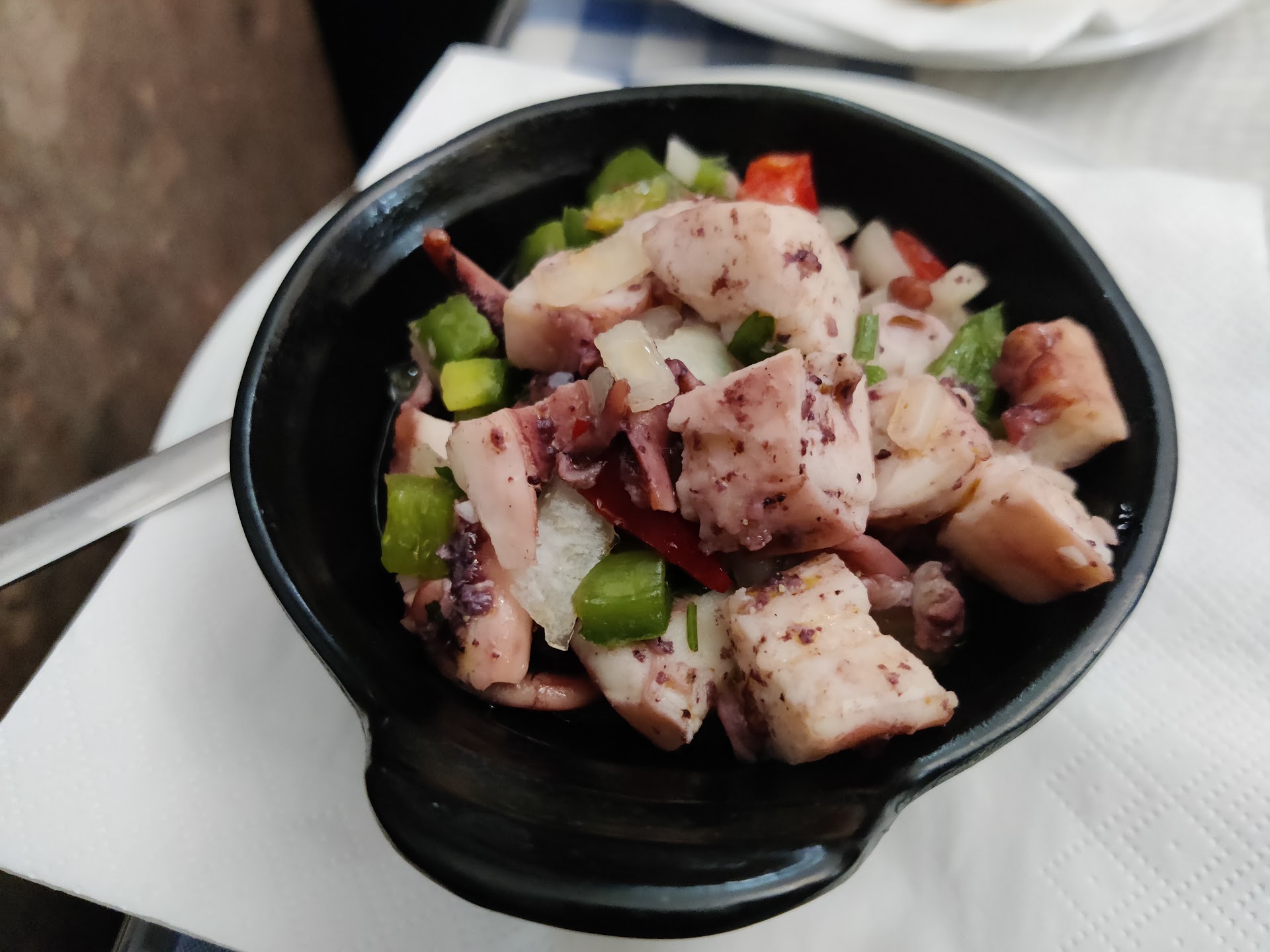 I ordered grilled sardine with rice and salad. For starter, octopus, that the waiter placed on the table. Both were tasty: the sardine fresh and perfectly grilled, the rice salad light, and the octopus had great texture.