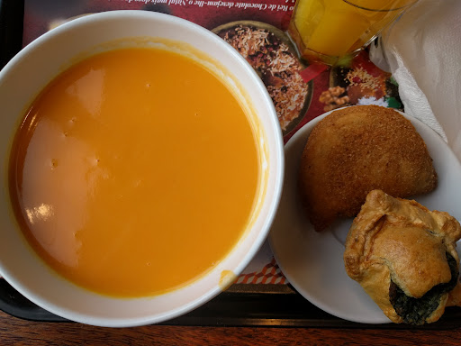 I came and asked if they still had soup which is part of the 4.95 sandwich, soup and drink deal/menu. They lady told me they still had, then she checked and informed me they were out. I asked her if there was an item that could replace the soup and she told me they had bags of sweet potato chips, for an additional .50 cents. I asked her if it was indeed 5.45 total for a sandwich, drink and chips no soup, and she said "that's right."