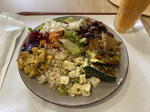 Read moreThis is a solid 4.5 stars at least. Inexpensive vegetarian food and friendly and helpful staff make this a sensible choice unless you crave meat at each meal. Choose your lunch with pricing based on how many selections you make. You'll get your fill for noticeably less than 10 euros. In addition to the seating you see as you come in, there is more in a quiet and restful outdoor patio accessed through the back of the restaurant. I would eat here regularly if I lived...