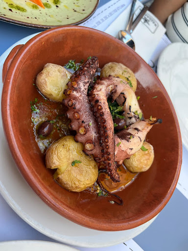 We started with the prawn, avocado, and mango salad (with shrimp). It was super fresh and full of flavor. For mains, we shared the sea bass fillet with jacket potatoes and roasted vegetables, the linguini nero with seafood from the Portuguese coast, and the octopus à lagareiro. Everything was delicious. The octopus was incredibly tender, which says a lot because it is not easy to cook it that well.