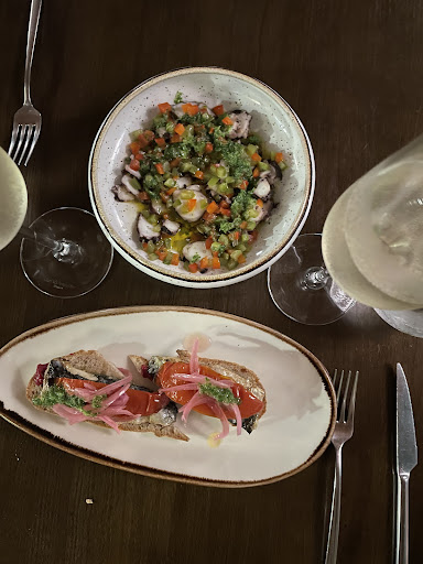 Read moreWe made reservations for 7:45 PM Friday. We arrived on time and were greeted at the door and were immediately welcomed into the restaurant and taken to our table. The restaurant is atmosphere cozy but very enjoyable. Great Rock / Blues music in the background to set the vibe and fantastic menu. We started with two glasses of Spumante…the Head Waiter’s choice, it was refreshing and crisp. For starters we ordered the Octopus Salad and the Sardine Escabeche. Both were excellent. The octopus was tender and flavorful. The Sardines weee presented on grilled bread topped with pickled red onions and sautéed thinly sliced red peppers. Briney, mild pickle onion and meaty sardines… perfection. For the main we enjoyed the Black Pork Cutlet on a savory bed of mashed potatoes and the Codfish deconstructed and served with a medium boiled egg on top. For dessert we shared the Bread Pudding. The service was excellent. The food was delicious. Great value and a very...