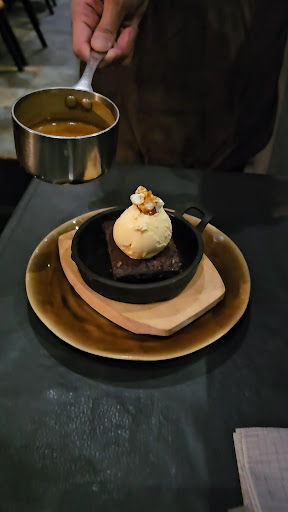The sweet menu is fairly small but contains some wonderful dishes including apple crumble. I went for the brownie on the waitresses recommendation. Wow, this was super. The brownie came on s hot skillet which was causing it to go chewy on the edges. Ice cream was piled above and hot toffee sauce was poured over it all so that it sizzled and bubbled on the oven hot container. It was a delight.