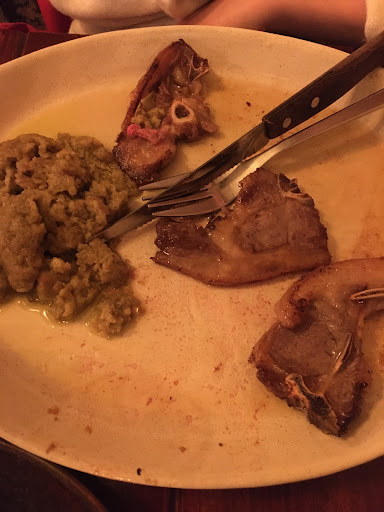The lamb chops (see photo attached), had next to no meat on them, and tasted boiled. I am unsure what the side is that is included in the photo, but that was all there was on the plate.