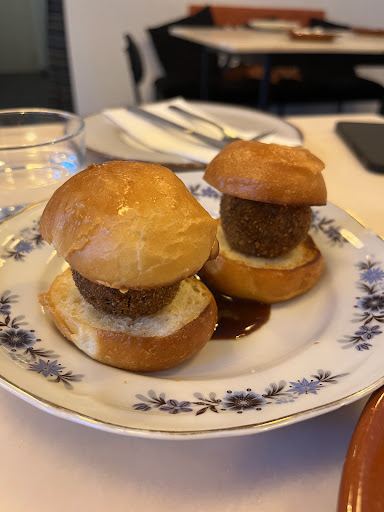 Went for an early dinner. We had a 7pm table. The restaurant was just us for our dinner part. And it's a very casual vibe and chill open kitchen to view everything. The menu is with chalk on a board that proves things are fresh and might change often. The plates are mostly tapas size, and to share mostly is the idea to get a taste of various things and variety. Wines are on display, too, and it's a small stock to choose and pick. We ordered the brioche croquets, the bacalhau pasties, the class rice, the chocolate dessert, 3 bottles of 0 alcohol beer and were ok. The plates were lovely and with a signature twist. I loved the rice. For me probably as we were alone for an hour, we felt a bit rushed by the service. And a bit pricy for the casual space for lisbon pricing...