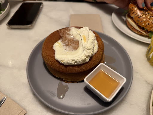 But the real star? The pancakes. Golden, light, and topped with a generous swirl of butter and a drizzle of real maple syrup—they melted in my mouth.