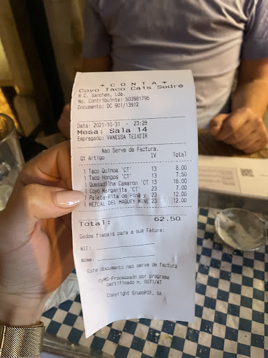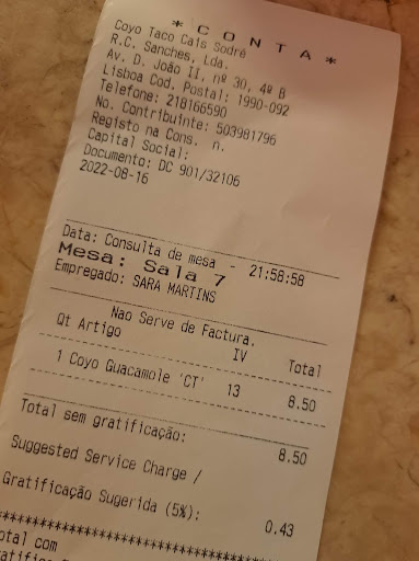 Also, each tacos are around 6€ a piece. That's extremely steep in Portugal. Also, tipping/gratuity is not required in Portugal. They add gratuity to the bill without any explanation, and customers, without realizing this, pay the amount printed in a larger type (total amount plus tip). I've seen other places with waitstaff give you a bill and request a tip while insisting that it's not required. Most places in Portugal just give you a bill without gratuity and don't even expect them. They won't even bring it up because it's not part of the Portuguese culture.