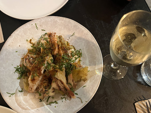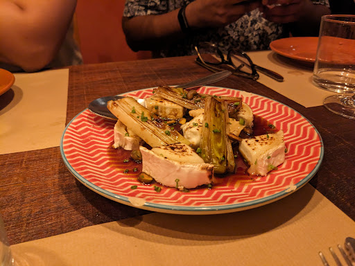 Read moreA wonderful restaurant whose service and food far surpassed anything else I sampled in Lisbon. The service was attentive, friendly and the staff spoke English. Atmosphere here was very cool, perfect for an evening with friends with chill, varied music. By contrast the menu was very simple with no English translations; if you ask for explanations they will help you! We tried the goats cheese and leek starter which was (for me) a unique flavour combination that I believe would have been better enjoyed if eaten in tandem with the octopus bean stew. Alone the starter was fine but nothing I would rave over. The stew itself was warm and comforting, I would not say it was spicy but equal effort was put into seasoning the beans as the octopus. The desserts were mediocre at best, you could find better in Lisbon's plethora of pastelarias (I'd recommend Santo António's pastel de nata.) The cherry madeira cake was tough, the cake that was similar to carrot cake was decent but nothing special and the chocolate mousse was a typical mousse with an assortment of nuts on top; it isn't specific to Lisbon if that's what you're looking for. The dining experience was very pleasant so even with the desserts being sub par I would still give 5 stars and would highly recommend this to anyone visiting Lisbon! Pics: 1. goats cheese and leak starter, 2....