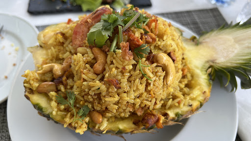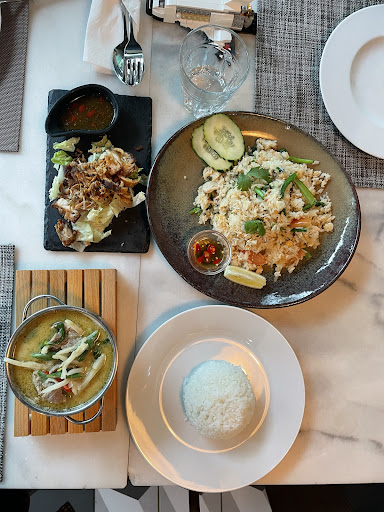 This is one of the best Thai restaurants for food quality , flavorful taste experience, atmosphere and service. The food was just amazing! The only disappointment was I looked at the menu online and I was hoping to order the Chili Crab Signature dish at the Lisbon, Portugals location or the mussels. For some reason these two dishes are only served at their Cascai location. I’ll assume based on price and customer. Had Suea Rong Hai skirt steak perfectly grilled medium-rare and the delicious spicy chili fish sauce that accompanies it. The Khao Pad Chicken fried rice with spicy fish sauce delectable and made PERFECT. Pad Kra Pai Moo Minced Pork, with Thai bird chilis, garlic and Basil that was absolutely delicious. Last the classic Pad Thai with tofu with crushed peanuts and dried chilis. Probably the best quality and most flavorful Pad Thai I’ve ever had in while other than Thailand. Portions are fair and good but not huge. Service was great too always at attention. Fries banana purée in wonton wrappers drizzled with honey and strawberries and a side of toasted coconut ice cream...