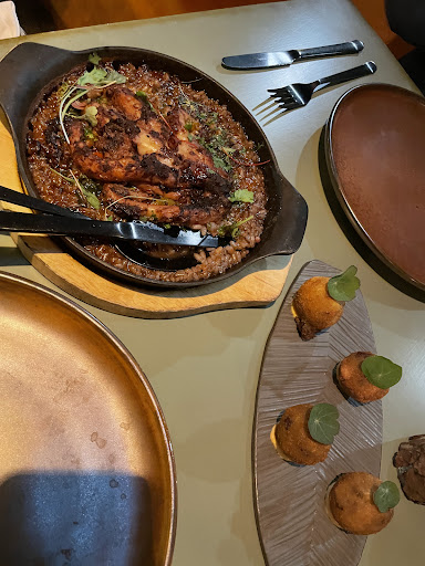 Our table was tended to by a charming young man by the name Francisco. Overall was a great experience. When we initially walked in we was greeted by the front of house lady in charge and that was all well were then seated for some cocktails just while waiting to have our table ready. This was all good all though from looking around it was easy to spot management and they were really the only bad thing i have to point out about this experience did not greet anyone while walking around very dismissive of clients and sort of telling others what they want done but in a very sort of snobby way. Anyway once seated the environment was really nice lighting was perfect decor really great making you feel comfortable and cozy and with a waiter like Francisco evening was set up to be fantastic as it was he was very skilled at the small talk while recommending bits of the menu and knew it all well absolutely brilliant the young man was me and my partner had a great time much to the credit of Francisco. I had the ox croquettes really tasty had a chilli sauce which added brilliant balance. The main i went for the pork cheeks, fine meat great potato pure and the mushrooms a delight throughout. Initially did not plan for a desert but Francisco swore by the caramel cake and my was he right we ordered one to share but now i regret not having ordered for myself it felt gorgeous in the mouth. Thanks to Erva and mainly Francisco i recommend and would definitely come back just need to tell management to be more engaging and make people feel welcome and important no matter what...