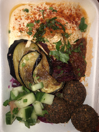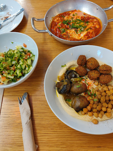 Read moreThis is in a space shared between multiple restaurants. We found a sitting place at long bar chairs. Went to order and received an electric pager. We took: Shawarma in a pita bread. The shawarma was like most places in Portugal; to me it wasn't fat enough. The pita bread was a bit dry. Hummus complete with tahini, mushrooms, and hummus beans was good, as were all the ingredients. Hummus shakshuka. In shakshuka the egg should be boiled inside the tomato sauce, but here it seems they just cooked a fried egg and put it on the hummus plate and poured the tomato sauce above it. Still, it was very tasty. A vegetable...