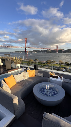 Read moreAmazing terrace with amazing drinks!! This visit was a 10/10 experience! This visit has been one of my highlights to my trip to Lisbon, I reserved a few weeks ago asking for a nice table with a view, which the staff did take into account once we arrived. When making a reservation it is specified at all times the minimum consumption of 25 euros and we are perfectly fine with it as you can have a drink and an appetizer to share, it is well worth it. The drinks are so good and well done, the couches are very comfortable and the VIEW wowed us!! So beautiful especially at the golden hour đ We overall enjoyed the experience and had a lot of fun. At night they turn on the heaters and give you blankets if you ask for them. The attention was very friendly and attentive, the DJ played...