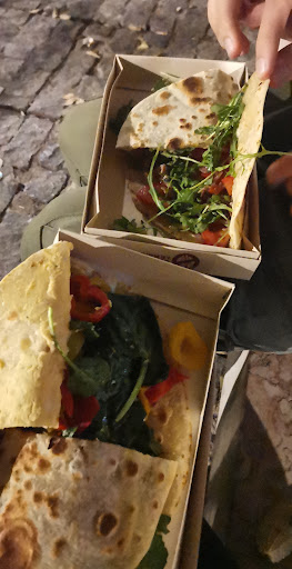 It's a small but charming restaurant where you can watch how you're food is being freshly made. The service is good and nice. I'd recommend to take the food to go though and enjoy it outside somewhere because the restaurant itself is rather small. However it's still a warm place to sit down if you need to rest for a moment. The prices are very fair. I had the vegan Piadina with hummus and grilled vegetables. While I enjoyed the dough a lot I feel like the filling could've been seasoned a little bit better. It was very very mild tasting. If you take an option with meat it's probably seasoned better. My companion had one with ham and he liked it a lot. However it's still great that they offer some vegetarian and vegan options to choose from. Overall I'd recommend to try out one of the Piadinas here. Especially if you're not very hungry and would prefer to have something small and quick to go. We were quite hungry and had an entire piadina each and afterwards were...