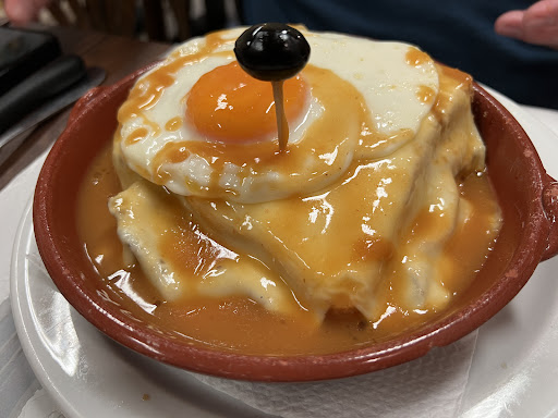 Very disappointed by the food and definitely didn’t appreciate the fact that the menu for tourists has increased prices. We entered and I tried to speak in Portuguese and was handed a menu in local language. As soon as they heard us talking in English, they came with a different Menu. I immediately noticed the higher prices and I asked to have back the original one. A guy came back trying to make up some sort of excuses saying that that menu is for dinner only but we just wanted to eat so we didn’t even go any further with that. They tried to charge the prices shown on the scam menu but it didn’t work out with us as we complained. Anyways, the francesinha was just average, nothing special. Not impressed at all and definitely not worth the long journey to reach this spot ———————————