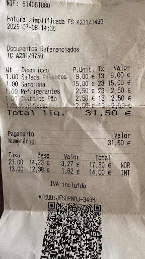 In all honesty, I'd never eaten at this particular restaurant before. Both the service and the food quality were just average. I ordered a plate of sardines and a small pepper salad without asking for a menu, and when it came time to pay, I was speechless. The sardine dish was slightly more expensive than in similar restaurants, but what truly surprised me was the cost of a small pepper salad. Most of the time, this kind of salad is included with the sardines, but here, they charged a hefty €9.00 for it.