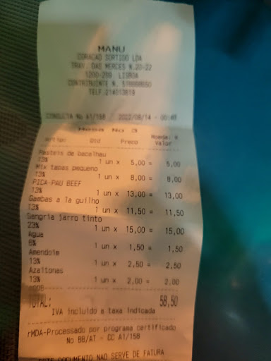 Extremely expensive for the quality and quantity of the food. We believe the good google ratings are staged. The tapas were terrible, the quality of the bread was mediocre and the ingredients used on top of it were average at best. The fried fish tapas were disgusting and no one can make me believe it’s “home-made”. PS: three small ones for 5€ is laughable. The shrimps and the meat dish were okay but for 11-13€ dishes the quantities were extremely small for the price it’s ridiculous. Lisbon has way better restaurants with better food and more reasonably priced! *The olives and nuts were initially offered to us as an entrée but we later found out that we were charged 4,50€ for it. **The sangria was not good, too sweet, mediocre ingredients were used and simply isn’t worth 15€. A 58€ bill for a 1 star “restaurant”. Absurd!