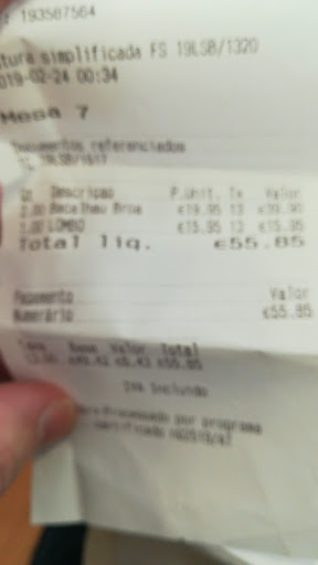 Pedi fatura com o valor que tinha pago, qual foi o nosso espanto vinha com 2 doses de bacalhau e uma de...
